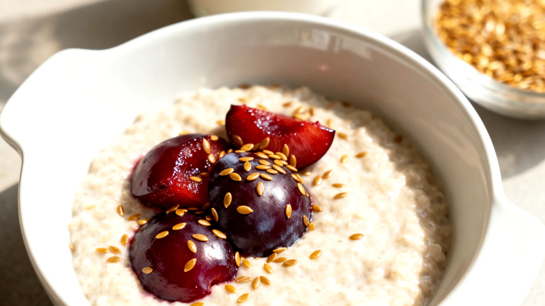 Lassen Sie die Mischung etwa fünf Minuten ziehen, während Sie die Pflaumen in etwas Wasser sanft dünsten. Das verstärkt ihre Wirkung und macht sie bekömmlicher. Entsteinete Pflaumen in kleine Stücke schneiden und bei mittlerer Hitze etwa zehn Minuten köcheln lassen, bis sie weich sind. Einen Esslöffel geschrotete Leinsamen unterrühren und das Porridge mit den gedünsteten Pflaumen toppen. Optional können Sie mit etwas Zimt, einem Hauch Honig oder Nussmus für zusätzliche Kalorien ergänzen.