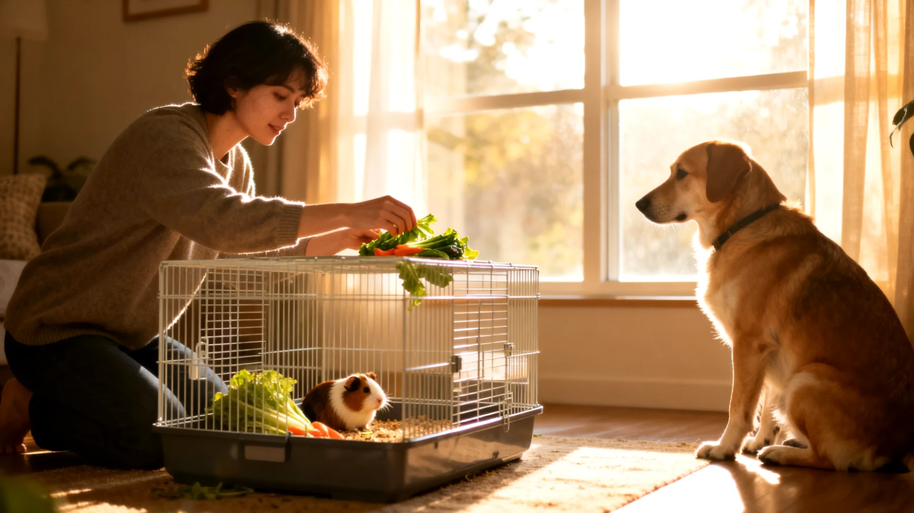 Das Meerschweinchengehege muss absolut katzensicher sein. Erhöhte Standorte für Katzen und abgeschlossene Bereiche für die Nager verhindern permanenten Stress. Fütterungszeiten können gezielt versetzt werden: erst die Meerschweinchen versorgen, dann den Hund füttern. So entstehen keine Futterneid-Situationen.