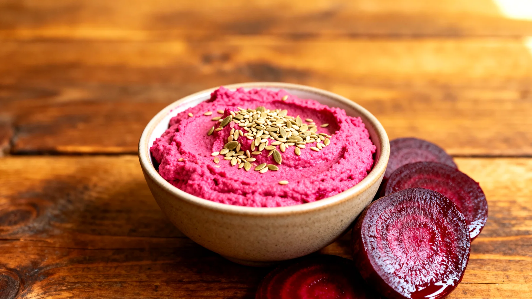 Besonders erwähnenswert sind die sekundären Pflanzenstoffe: Betalaine aus der Roten Bete wirken antioxidativ und können oxidativen Stress, der durch mentale Belastung entsteht, reduzieren. Rote Bete liefert zudem wertvolle Nährstoffe wie Folsäure, Kalium, Eisen und Magnesium. Die Kombination mit Tahini verstärkt die Aufnahme dieser Nährstoffe durch gesunde Fette und macht den Aufstrich zu einem echten Multitalent.