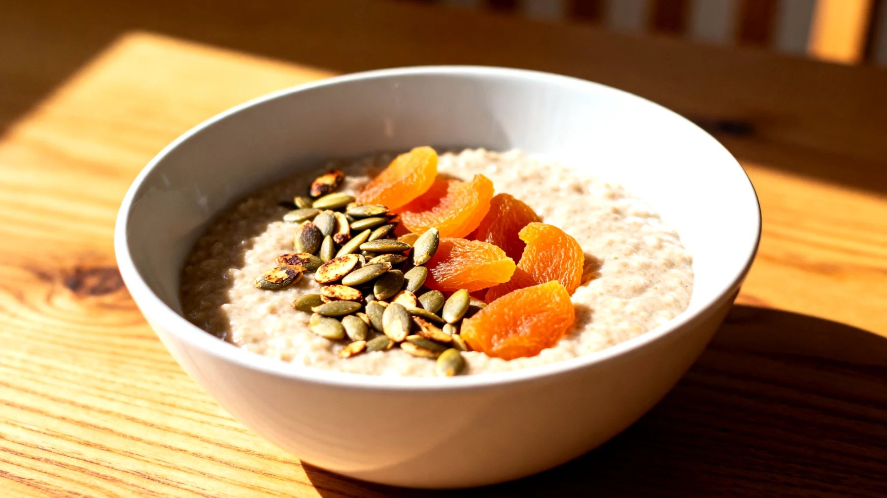 Geröstete Kürbiskerne ergänzen das Porridge nicht nur geschmacklich mit ihrer nussigen Note. Sie liefern zusätzliches Protein und gesunde mehrfach ungesättigte Fettsäuren, die für die Aufnahme fettlöslicher Vitamine wichtig sind. Besonders interessant ist ihr Tryptophan-Gehalt – eine Aminosäure, die als Vorstufe des Botenstoffs Serotonin gilt. Tryptophan-reiche Lebensmittel können die Sättigung regulieren und Heißhungerattacken vorbeugen.