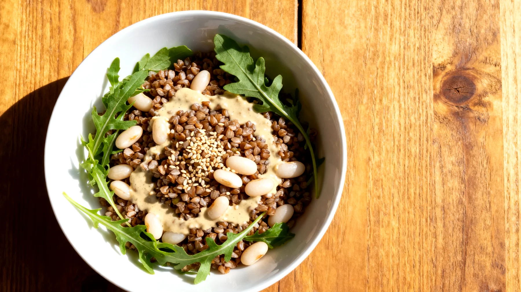 Buchweizen hat einen glykämischen Index von etwa 50 bis 54, weiße Bohnen liegen sogar bei nur 28 bis 35. Kombiniert mit den gesunden Fetten aus Tahin entsteht eine Mahlzeit mit niedrigem glykämischen Index, die den Blutzucker kaum in die Höhe treibt. Das Ergebnis: keine Insulinspitzen, kein abrupter Blutzuckerabfall – und somit keine Heißhungerattacken am Nachmittag.